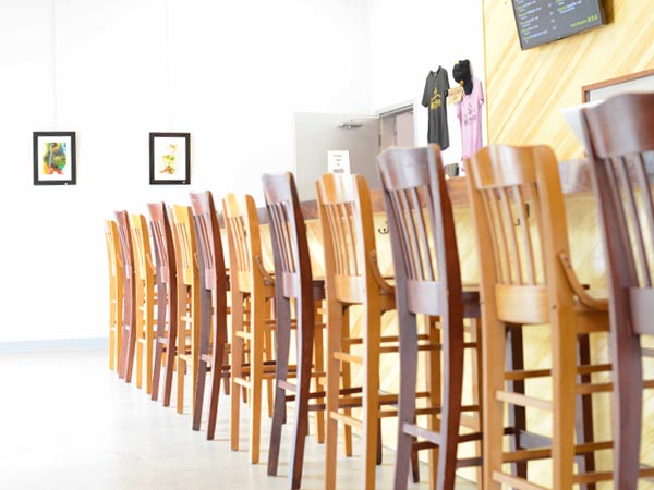 Solid wood furniture was upcycled from various sources, and a luxurious lounge and restroom facility was created for our female friends. Guys, we have a bathroom for you, too—it's just not quite as fancy. Our tasting room also features traditional wood dining tables and chairs so you can crowd around with friends at a table. Featuring a huge projection screen TV, we'll be sure to have the big games on TV, and you're also welcome to rent our equipment/taproom if you'd like to be able to screen your own video, give a presentation, or run a slide show at your private event.